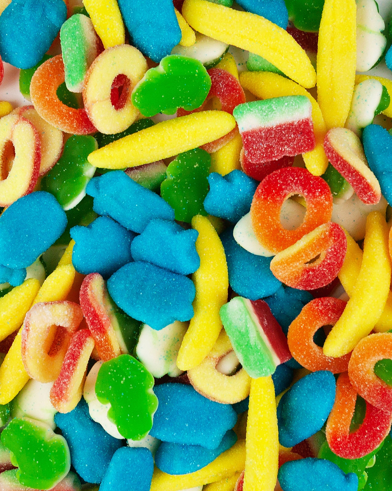 Glukosesirup, Zucker, Wasser, Rindergelatine, modifizierte Kartoffelstärke, Säuren (E270, E330, E296), Überzugsmittel: E901 & E903), Palmöl, Pektin, künstliches Aroma, Farbstoffe (E100, E163, E133, E129, E160a).